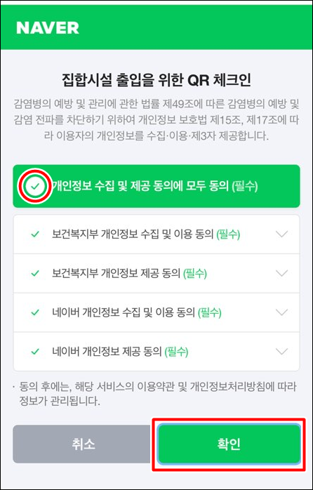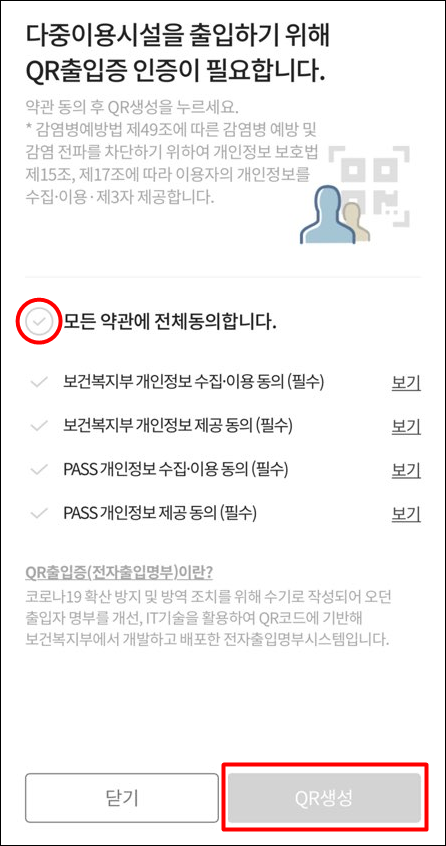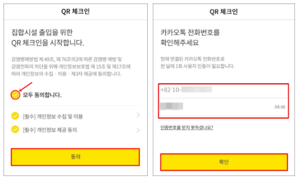 QR 체크인 이용을 위한 개인정보 제공에 대한 동의와 본인인증 절차를 진행하시면 됩니다. 그 이후에는 그대로 사용하시면 됩니다.