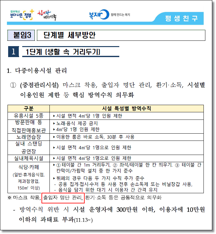 코로나19로 인하여 사회적 거리두기를 시행하고 있는데, 중앙재난안전대책본부가 발표한 사회적 거리두기 시행방침을 살펴보면, 1단계부터 출입자 명단 관리를 의무화하고 있습니다.
