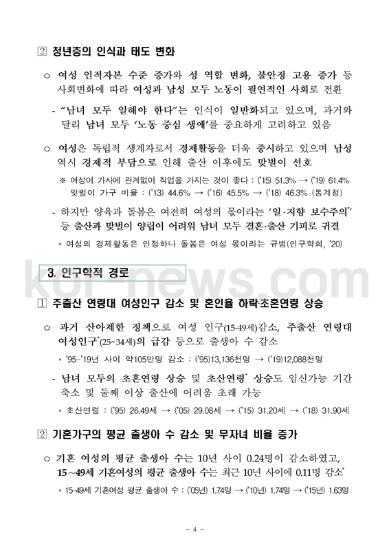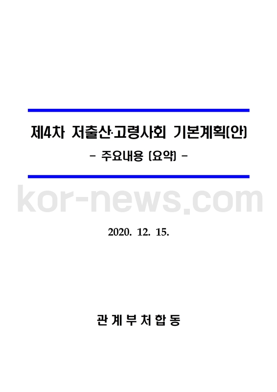 이에 정부는 '제4차 저출산·고령화 문제 해결 기본계획'을 국무회의에서 확정하고 저출산 대책을 발표하였습니다.